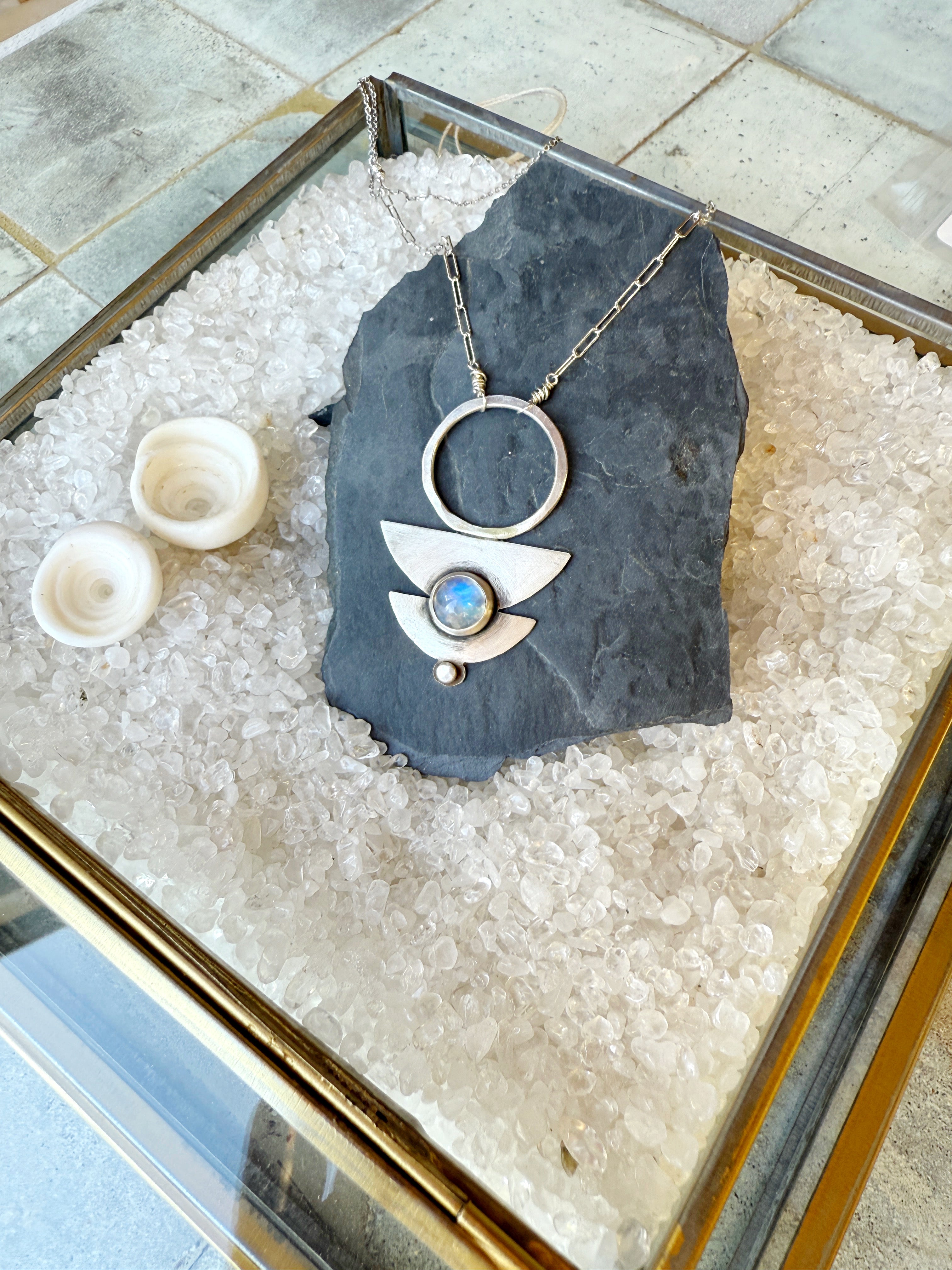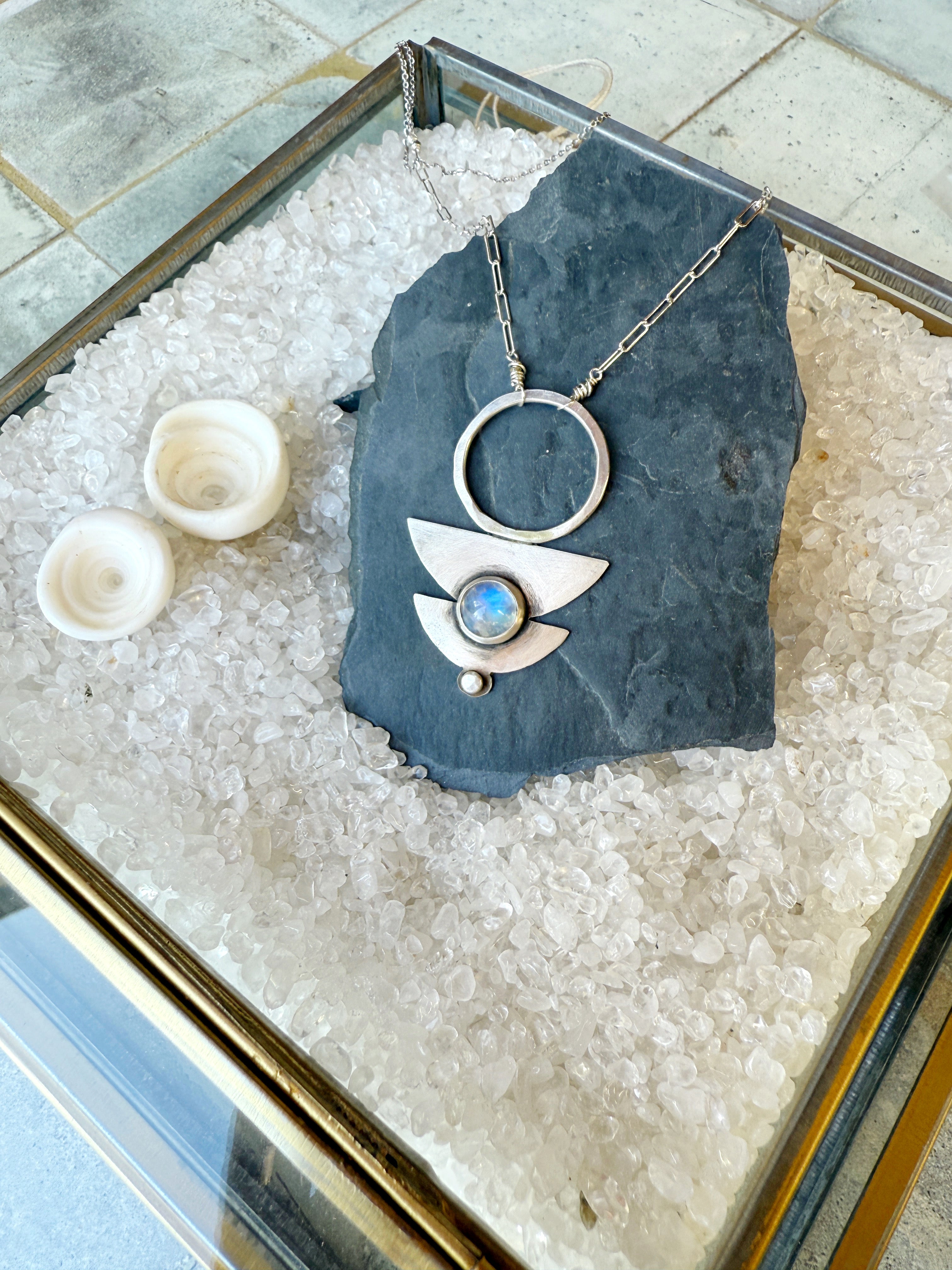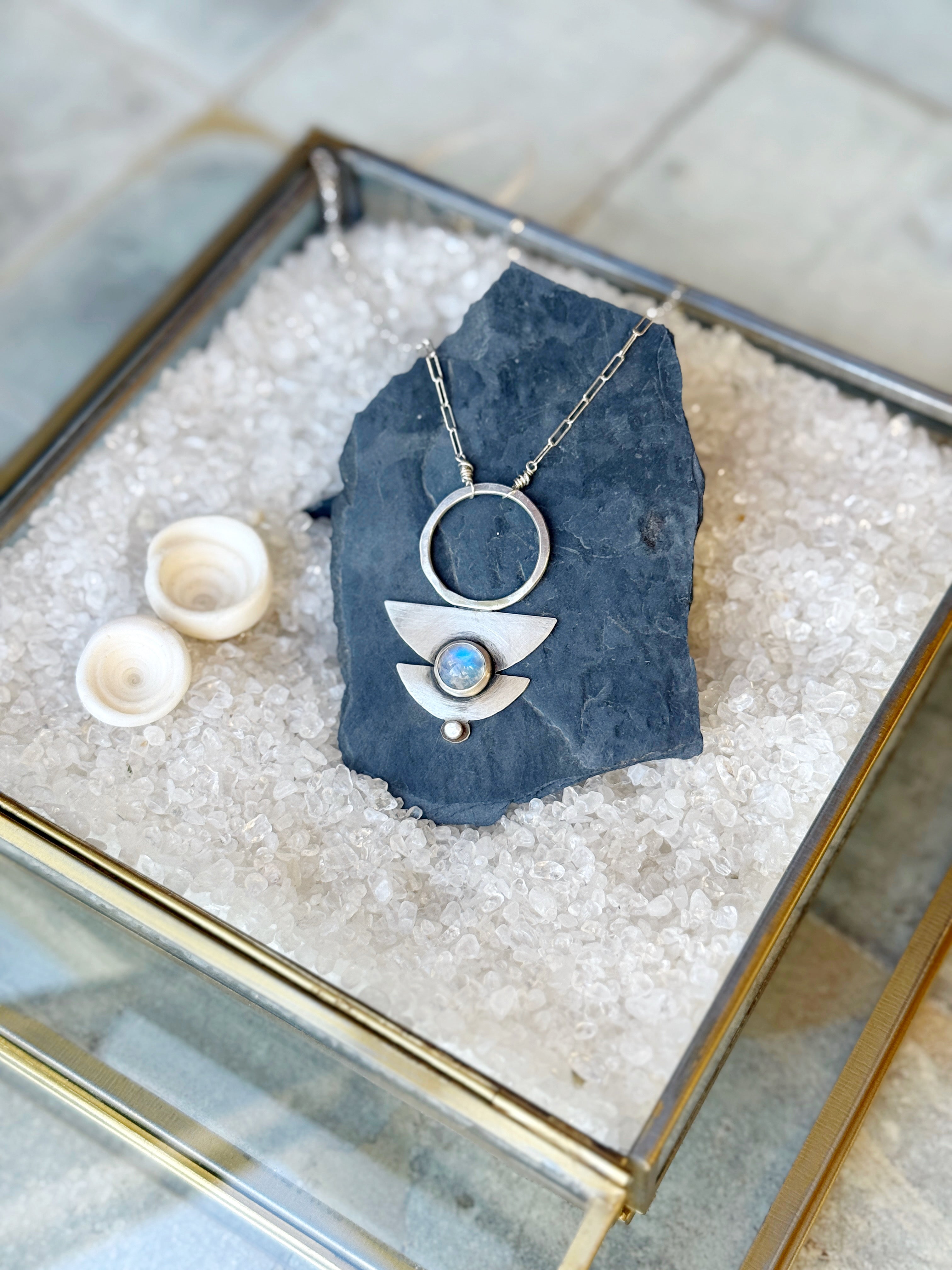 One of a kind Sterling silver pendant necklace made with beautiful high quality moonstone. The chain is adorned with tiny faceted pyrite stones.