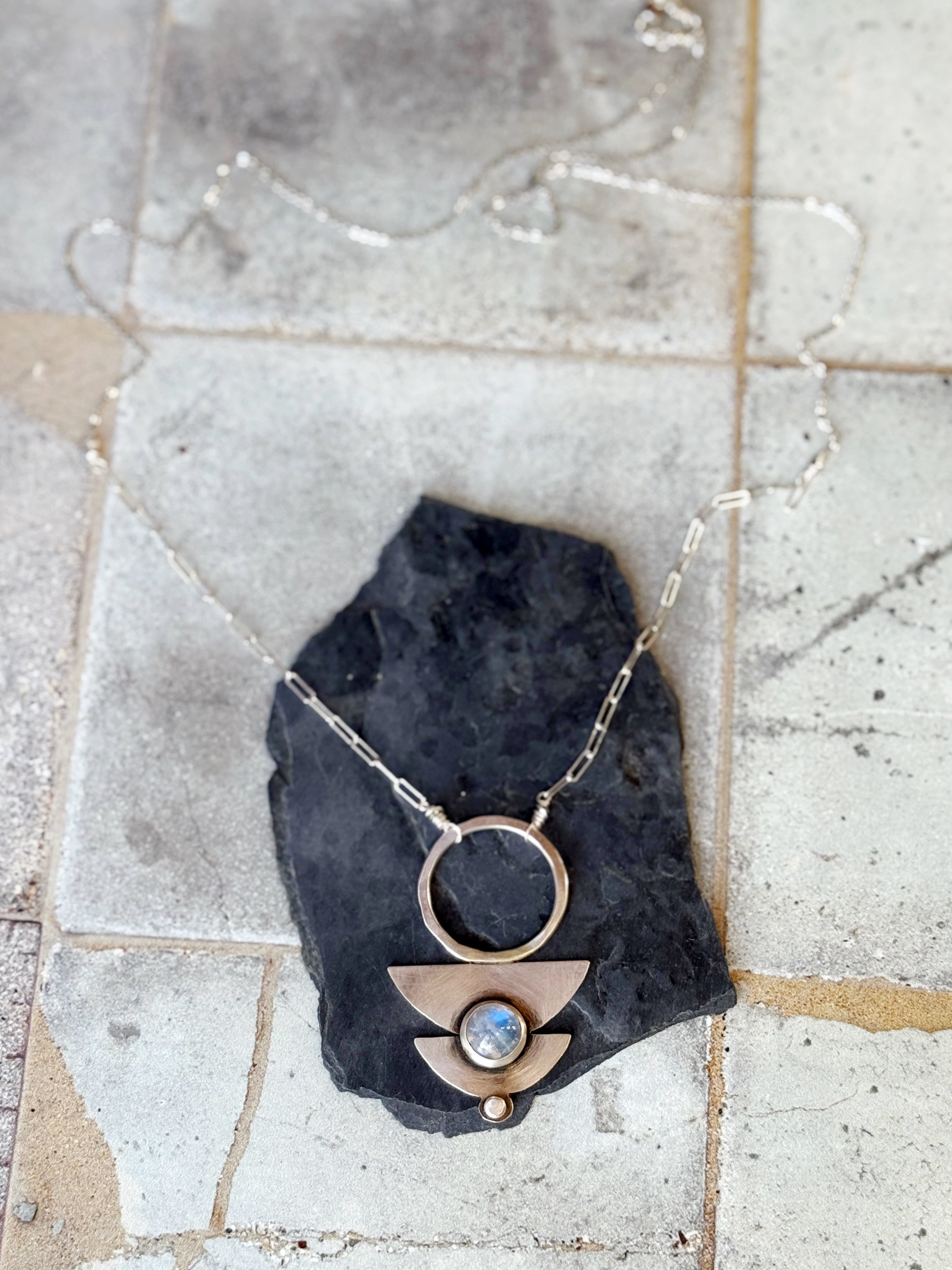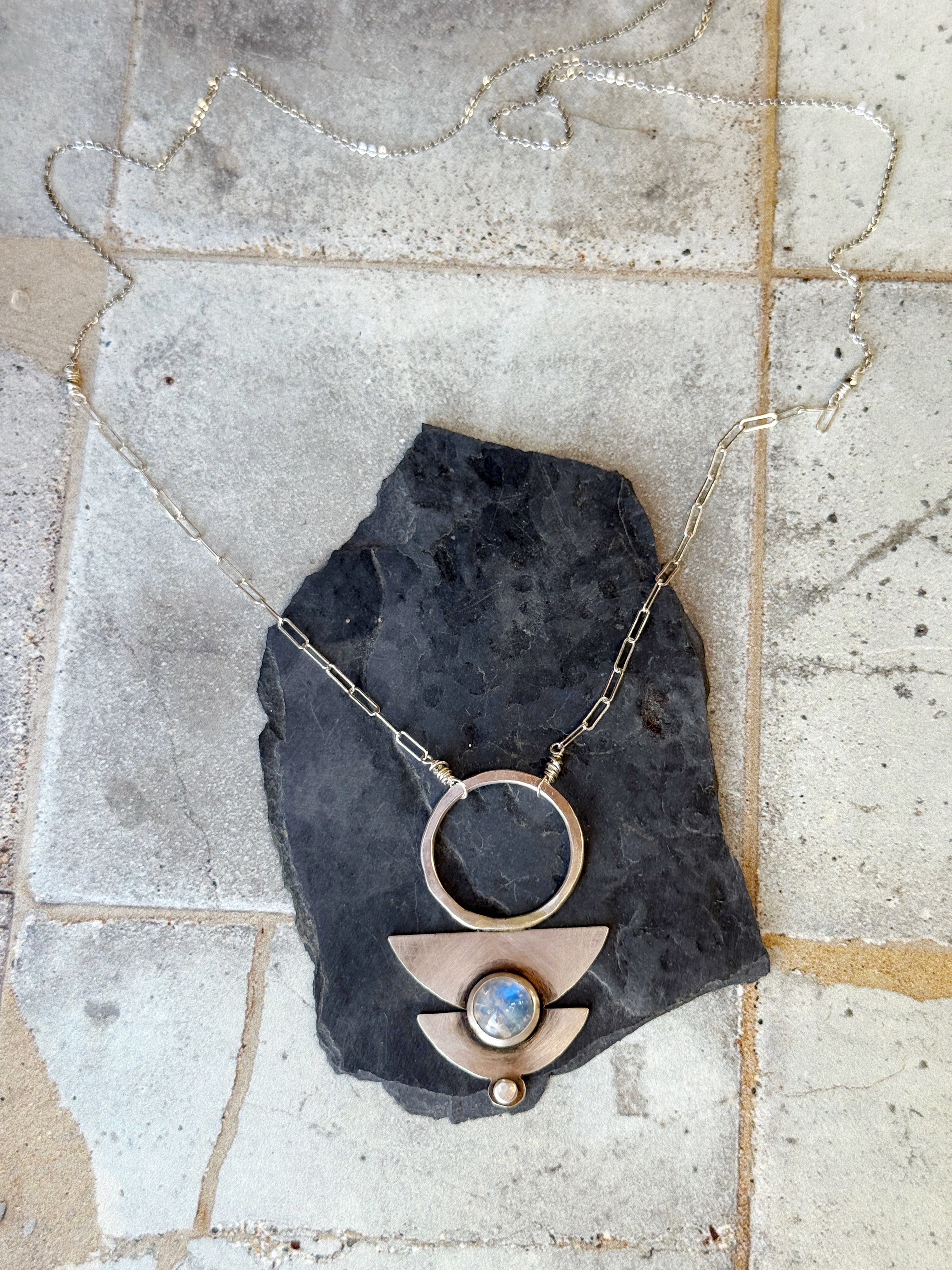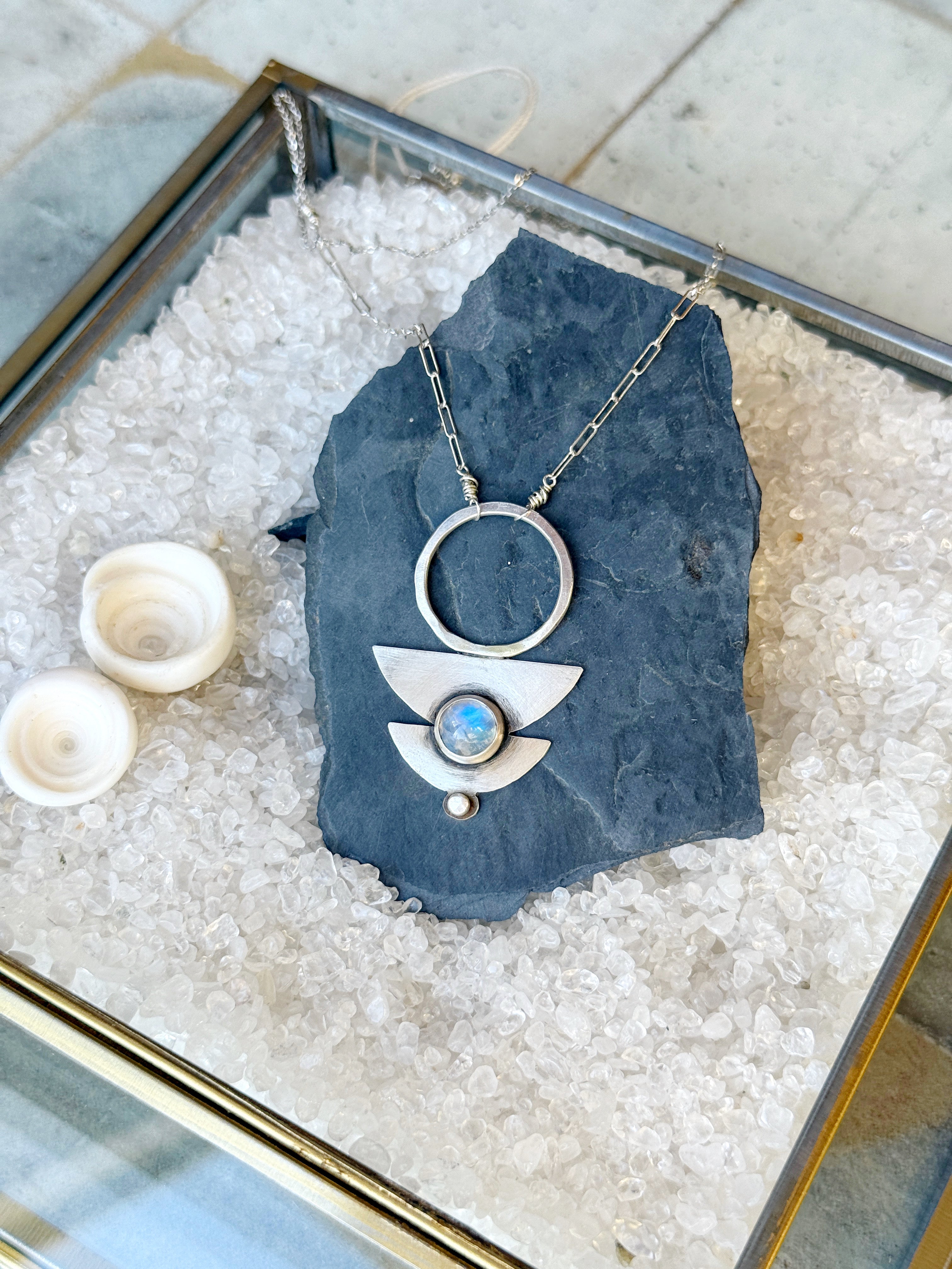One of a kind Sterling silver pendant necklace made with beautiful high quality moonstone. The chain is adorned with tiny faceted pyrite stones.