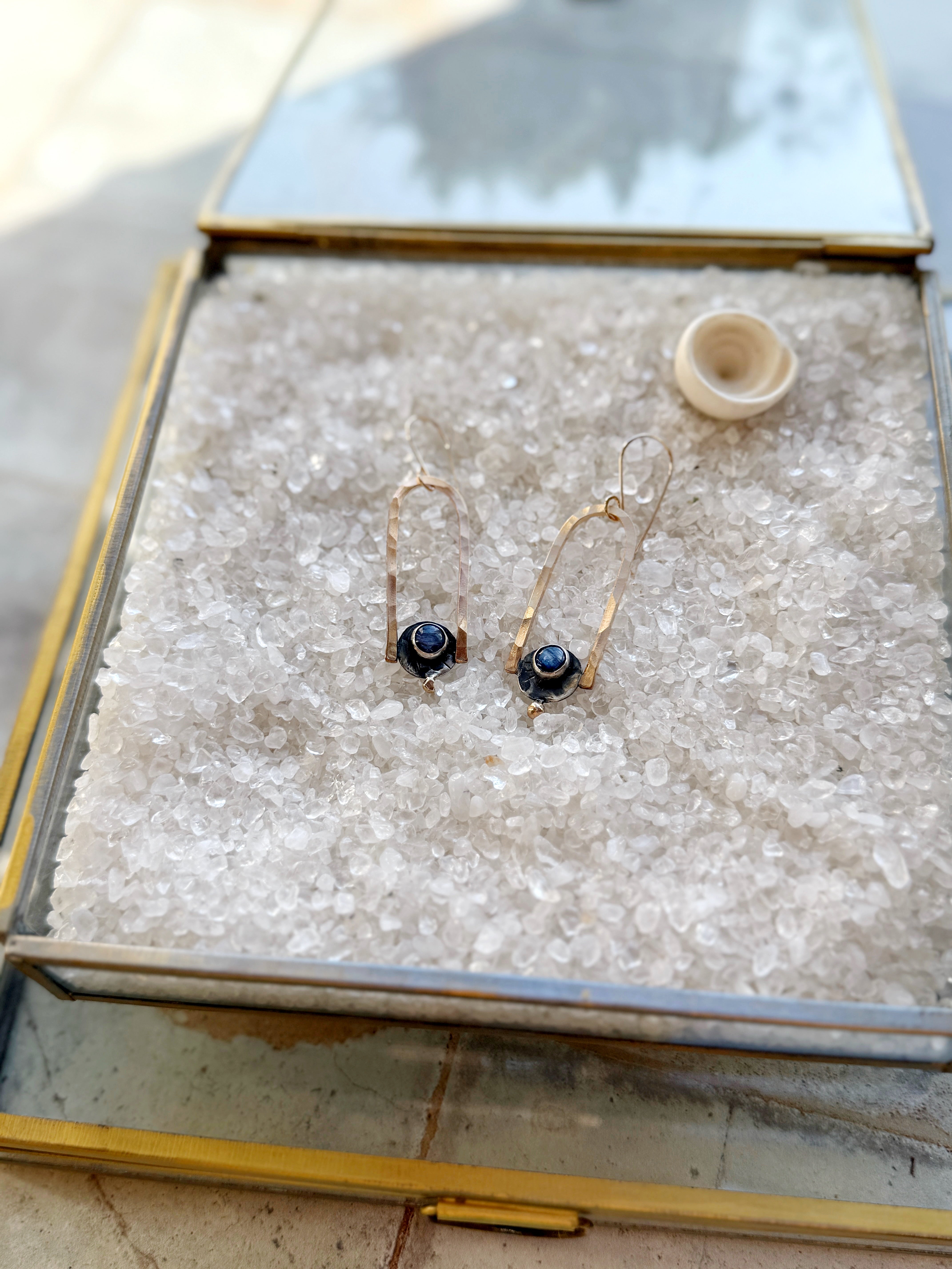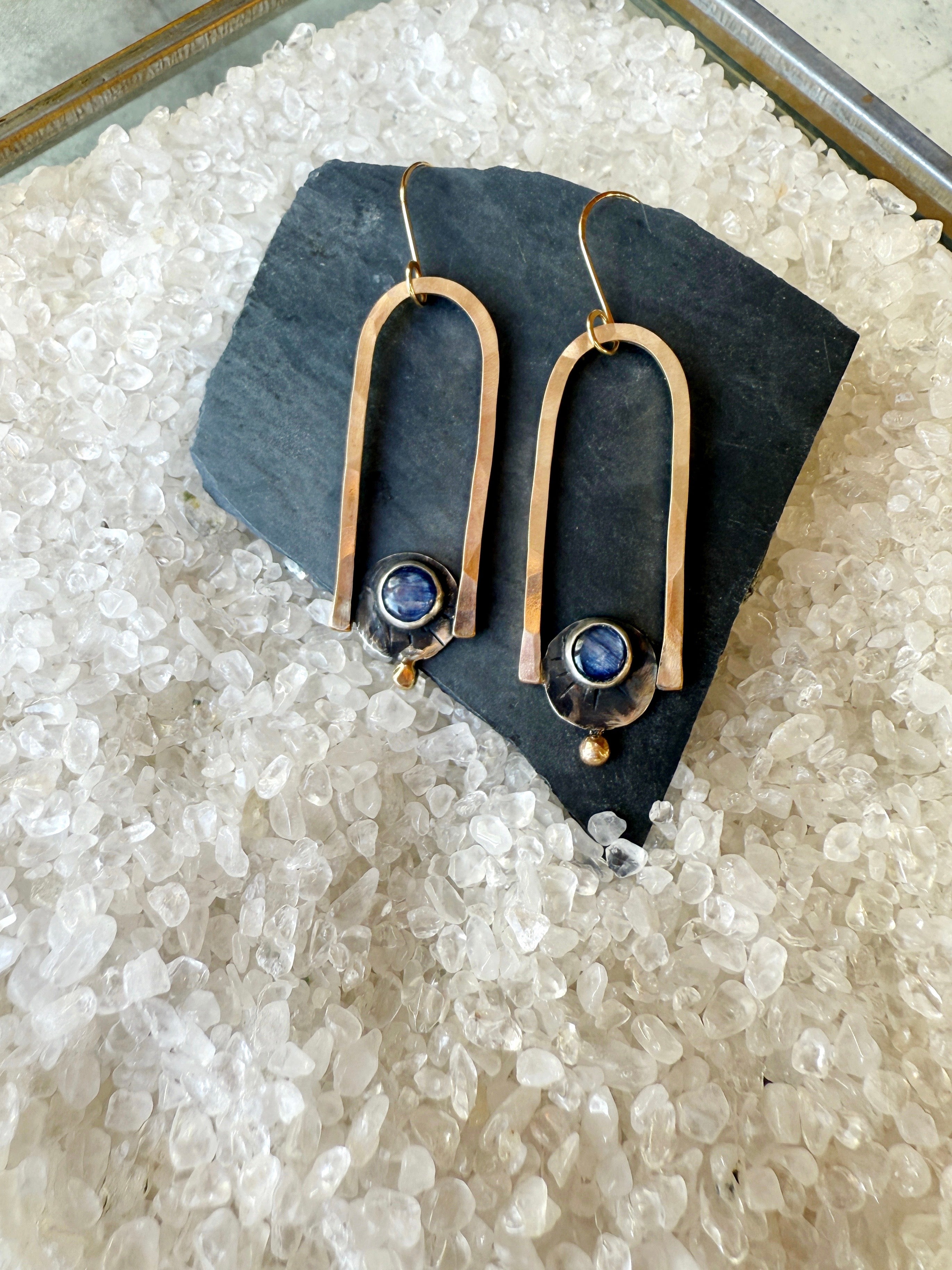 One of a kind earrings made with 14K gold filled wire, 14K gold and Sterling featuring deep blue kyanite stones.