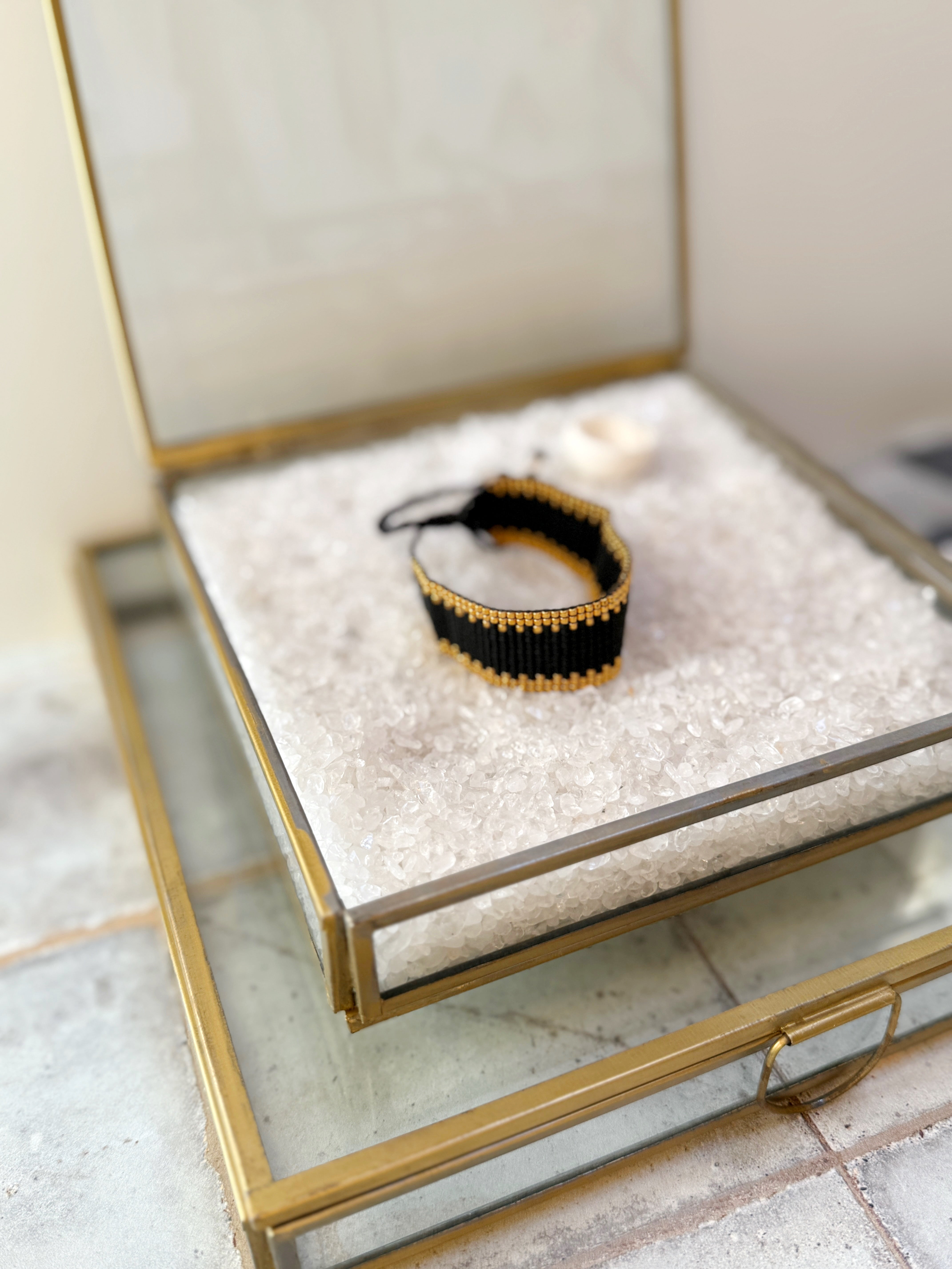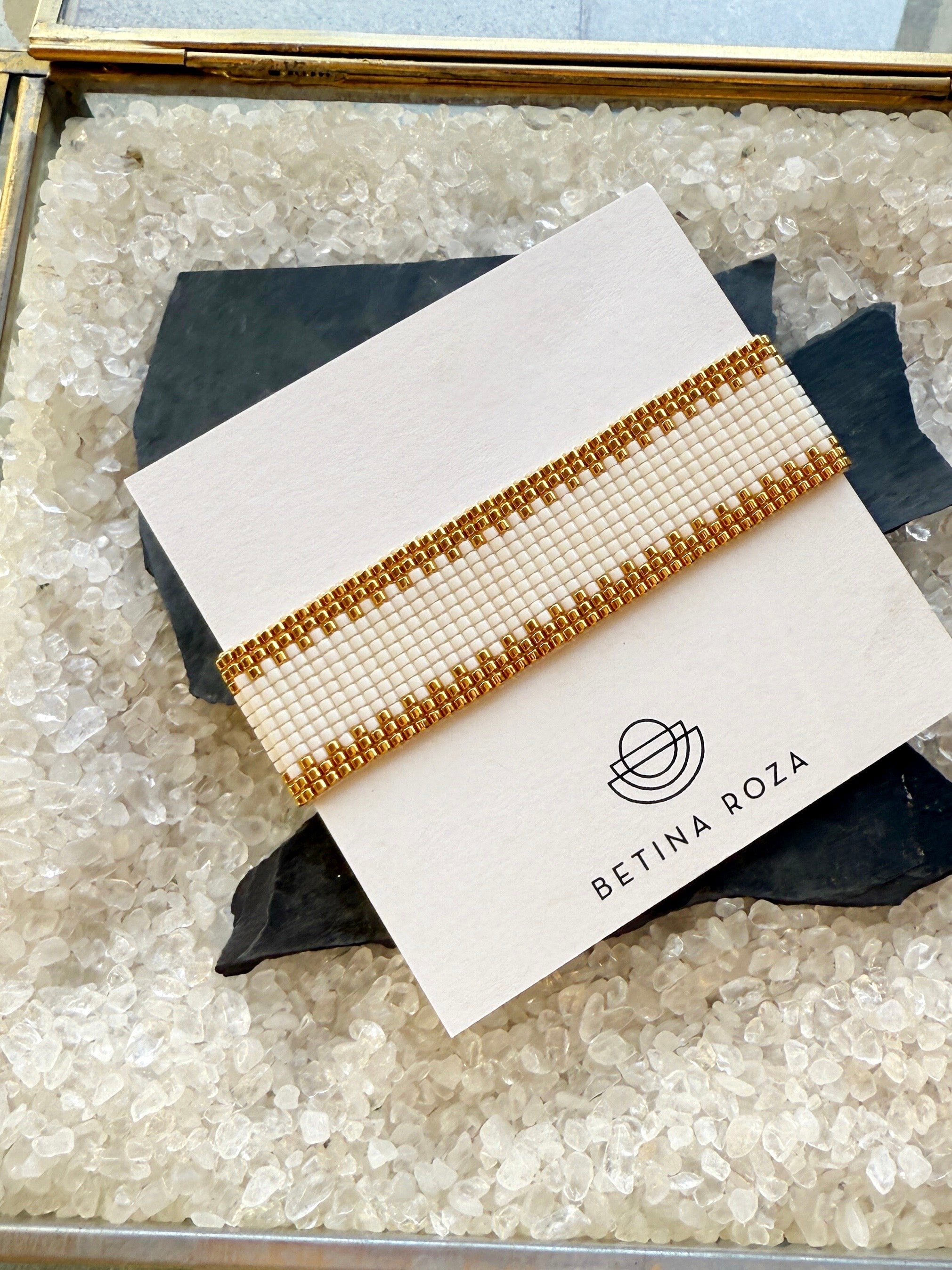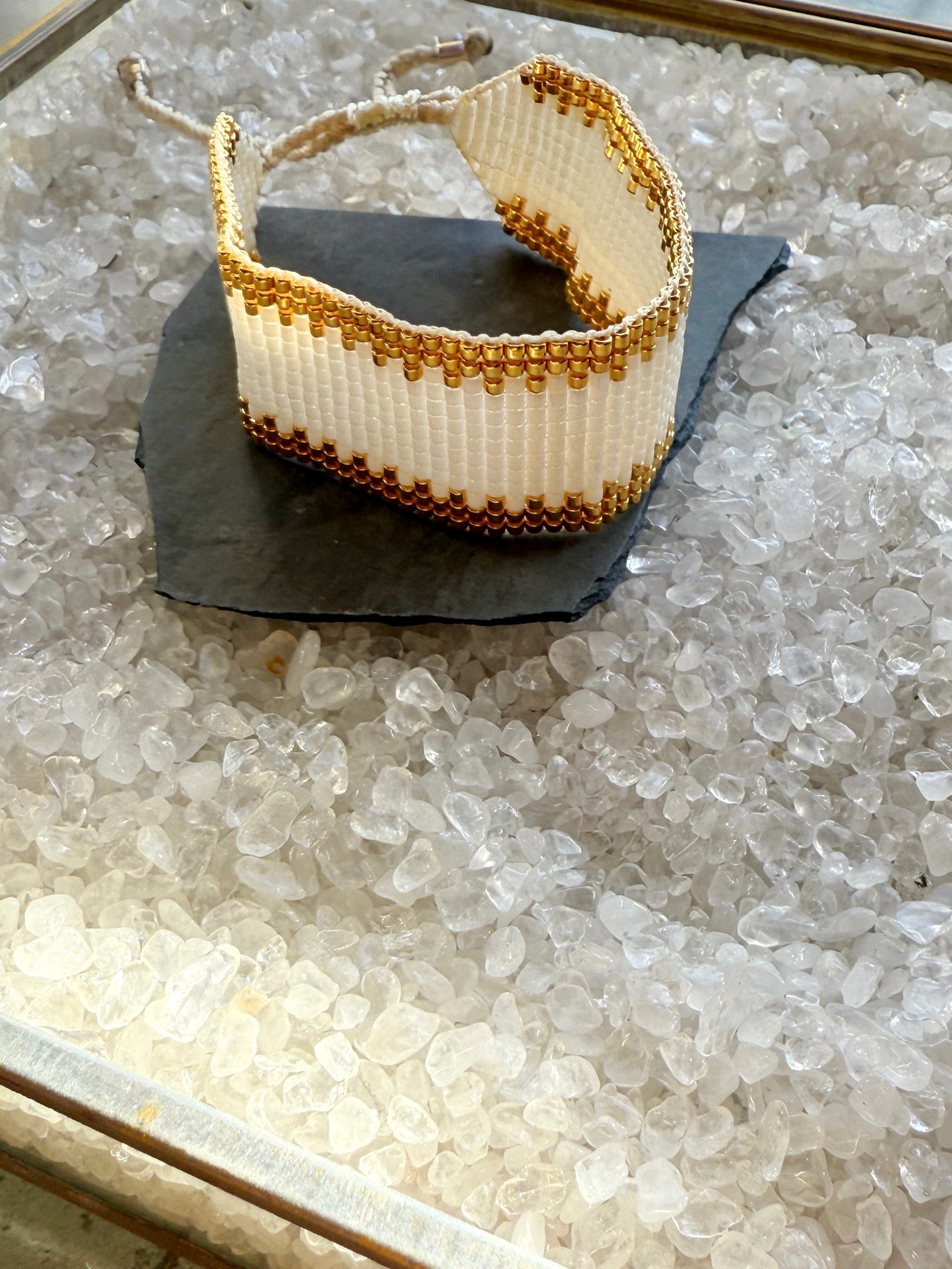 Hand woven adjustable beaded cuff bracelet in gold dust pattern. These bracelets are made with a loom, a traditional method in Mexico, but with a modern style and convenient adjustable feature. Because they are made with cotton, they are super soft and feel like woven fabric.