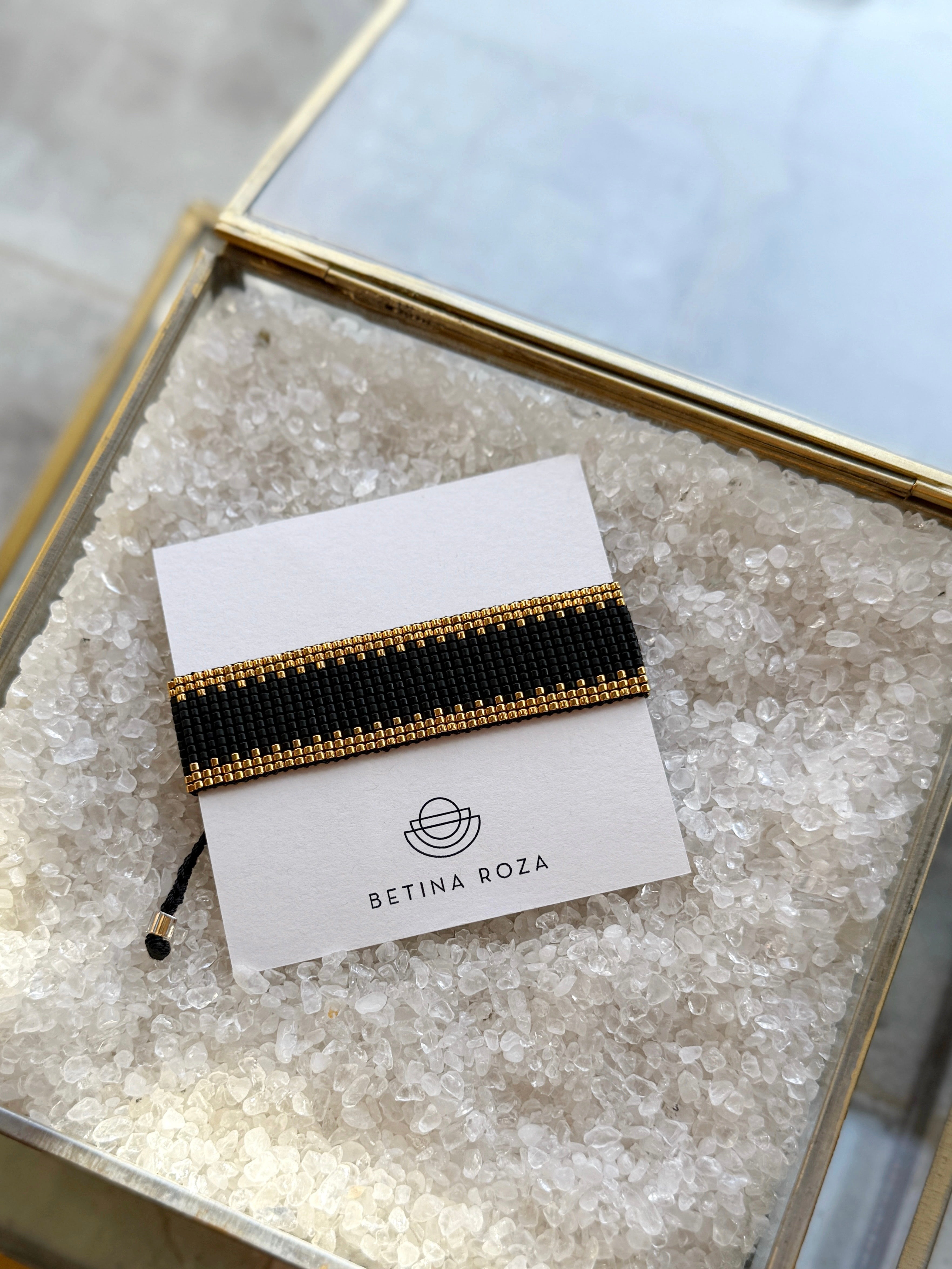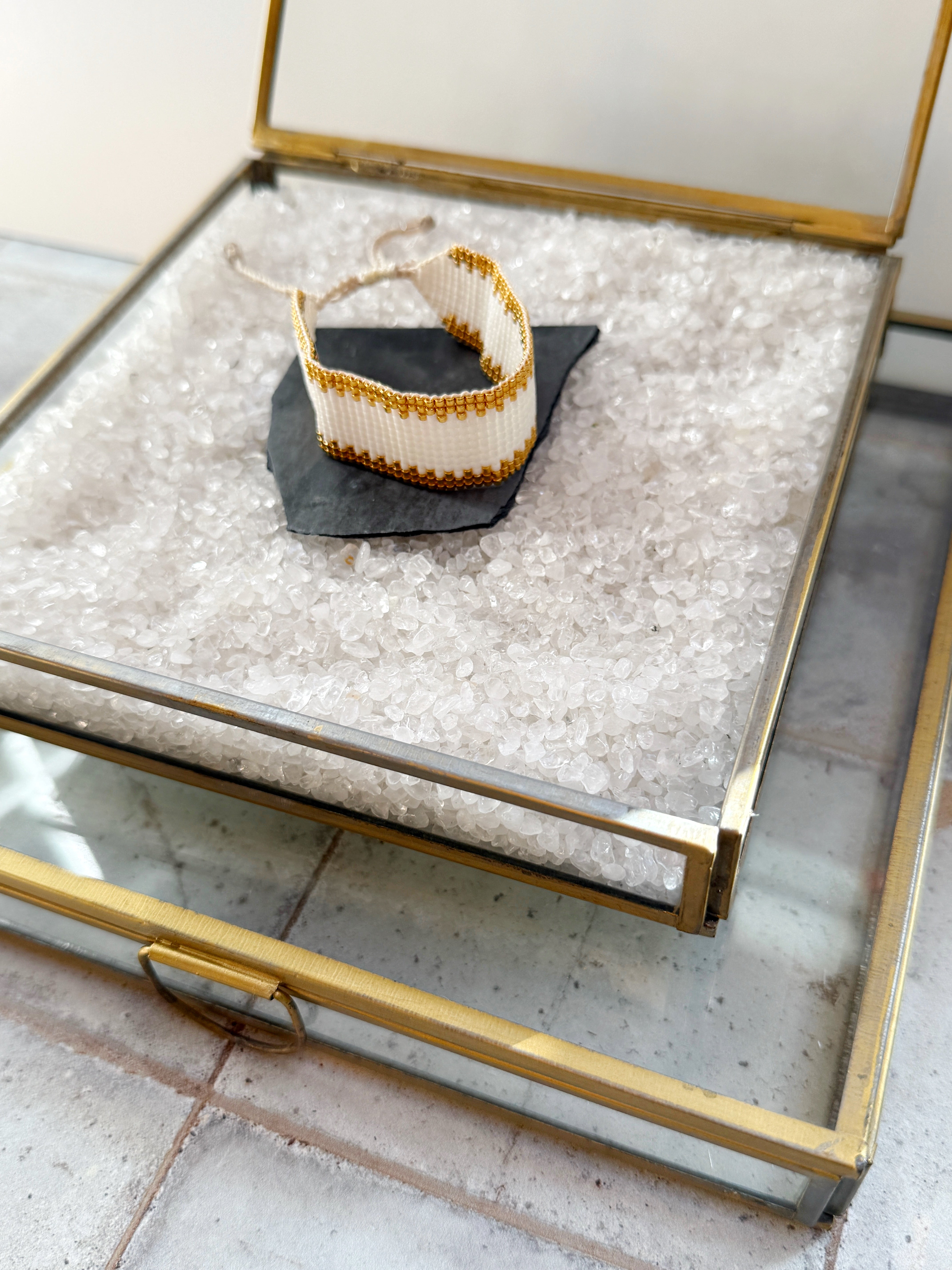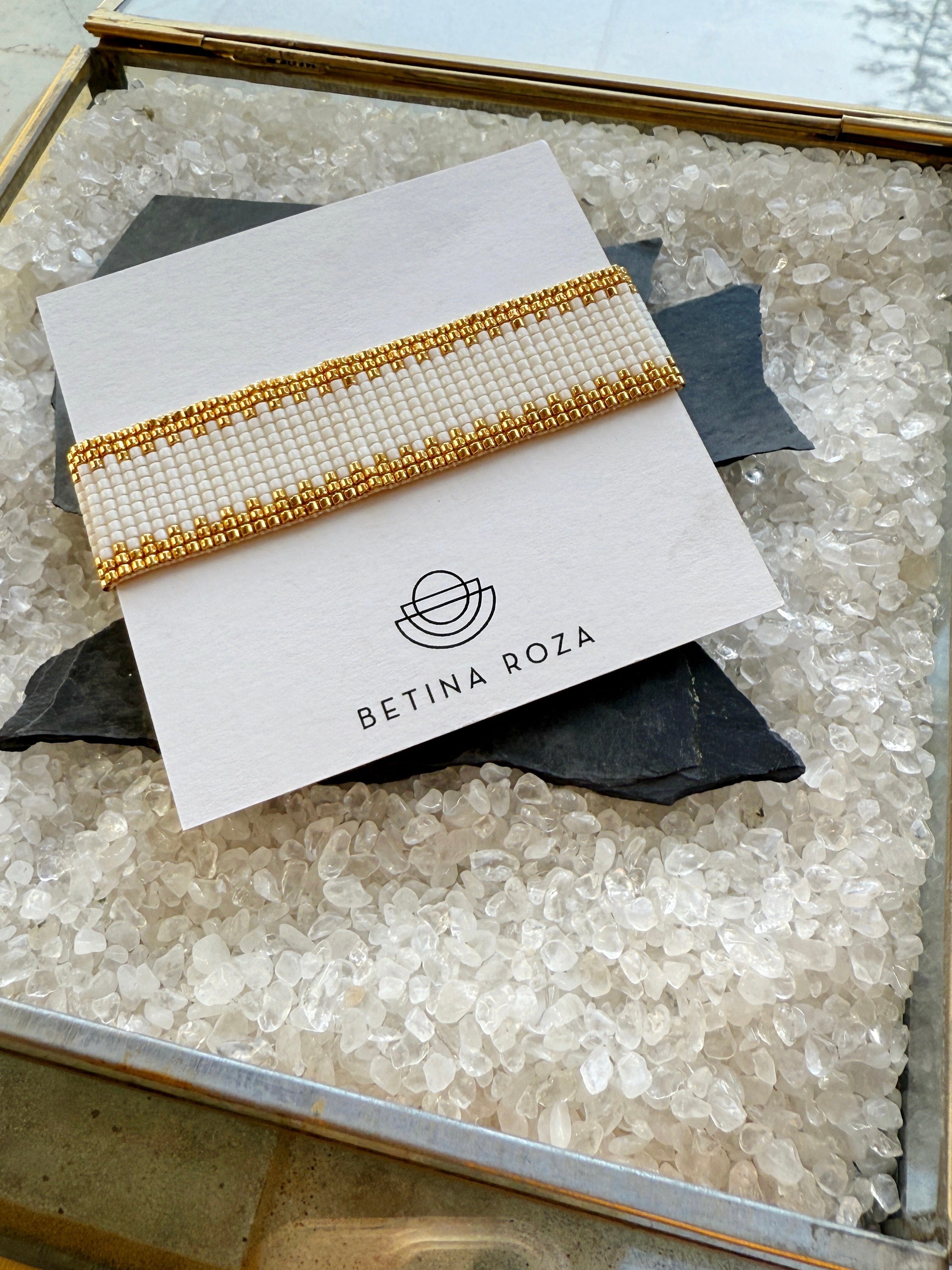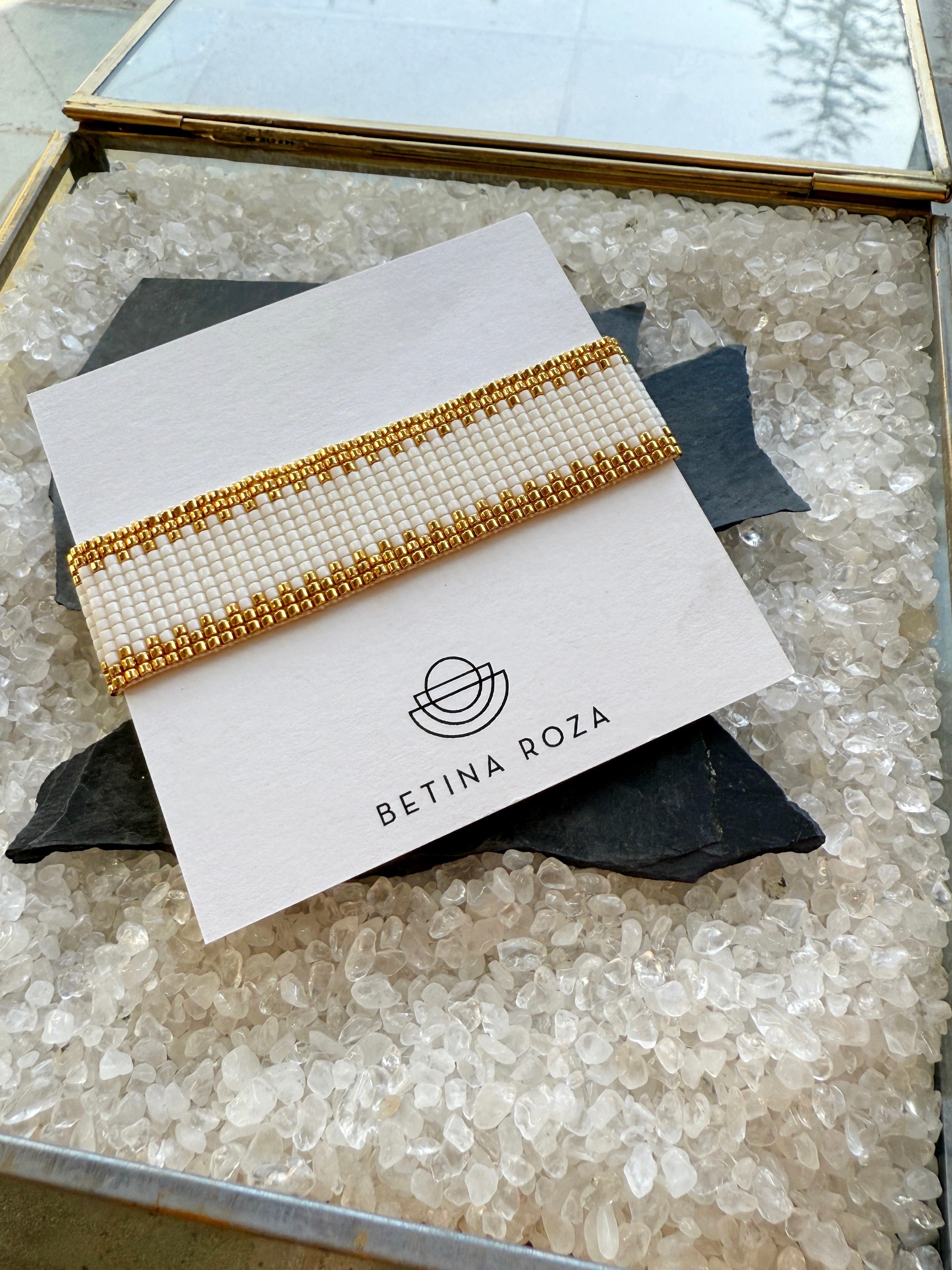 Hand woven adjustable beaded cuff bracelet in gold dust pattern. These bracelets are made with a loom, a traditional method in Mexico, but with a modern style and convenient adjustable feature. Because they are made with cotton, they are super soft and feel like woven fabric.
