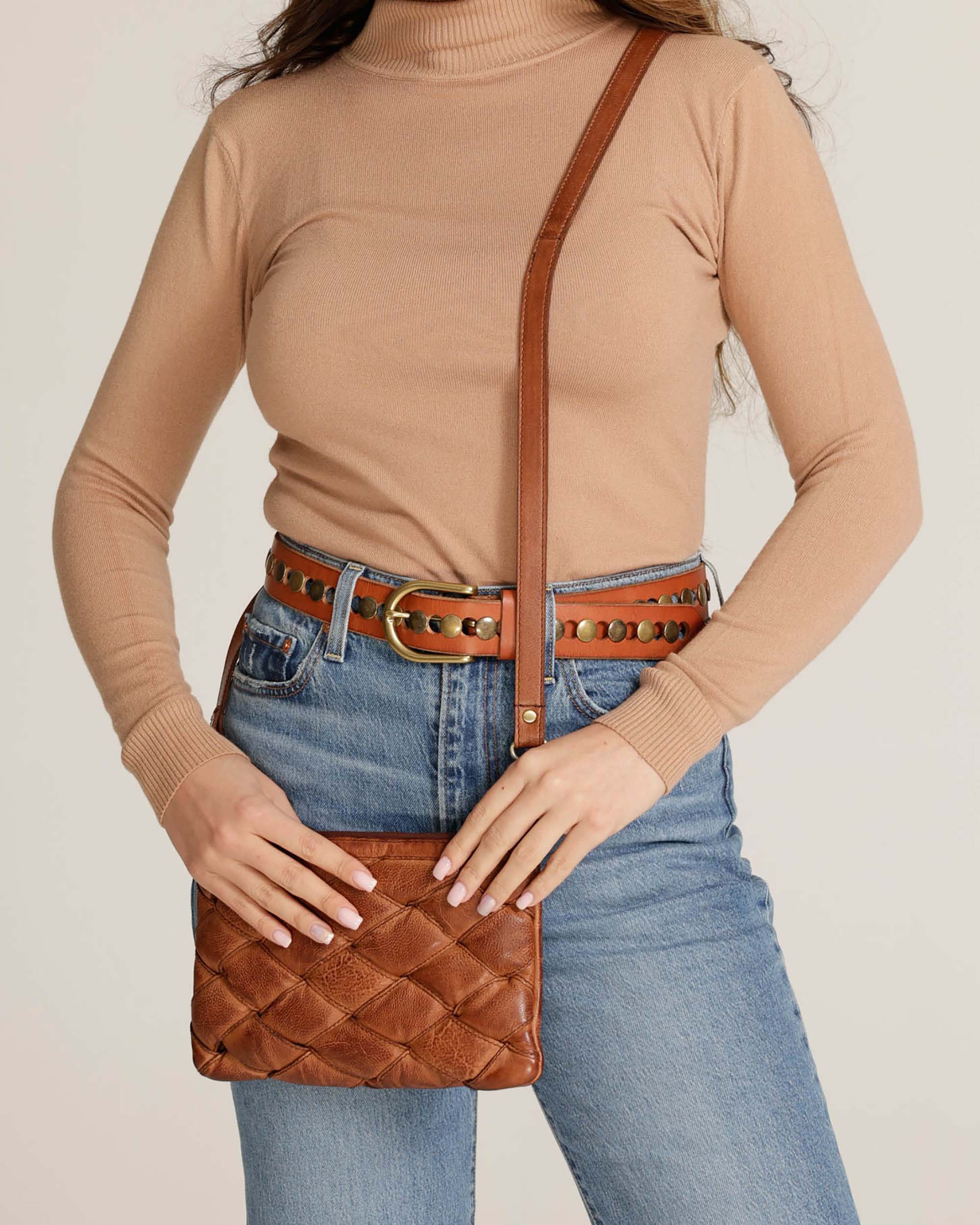 Effortless elegance meets everyday functionality with the Kelly woven leather crossbody bag. This artisan-crafted bag features an intricate handwoven leather design, adding a sophisticated yet relaxed touch to any outfit. Compact yet spacious enough for your essentials, it includes a secure zippered main compartment and a detachable leather strap for versatile wear as a clutch or crossbody. The supple, high-quality leather ensures lasting durability and a timeless appeal.
