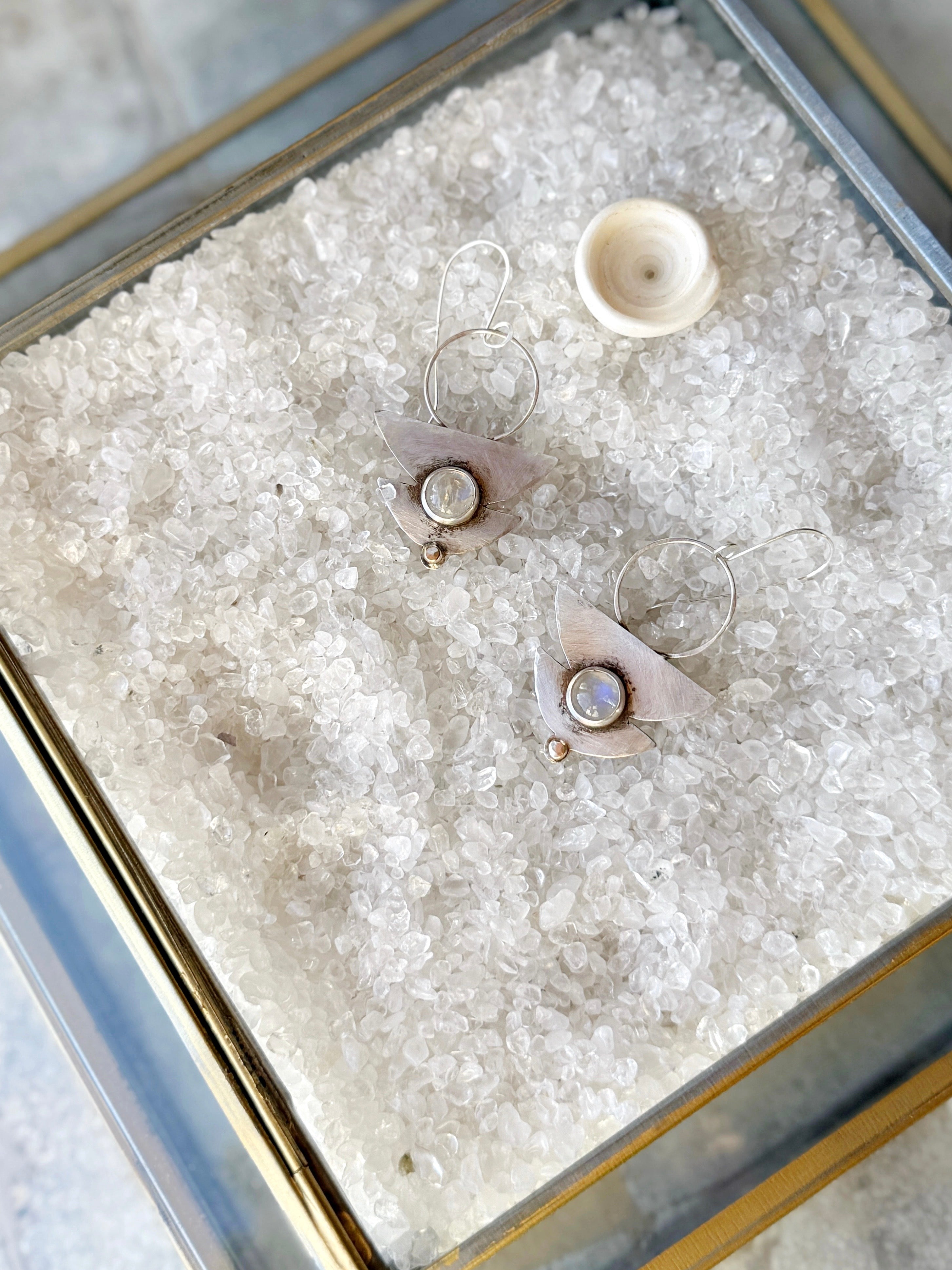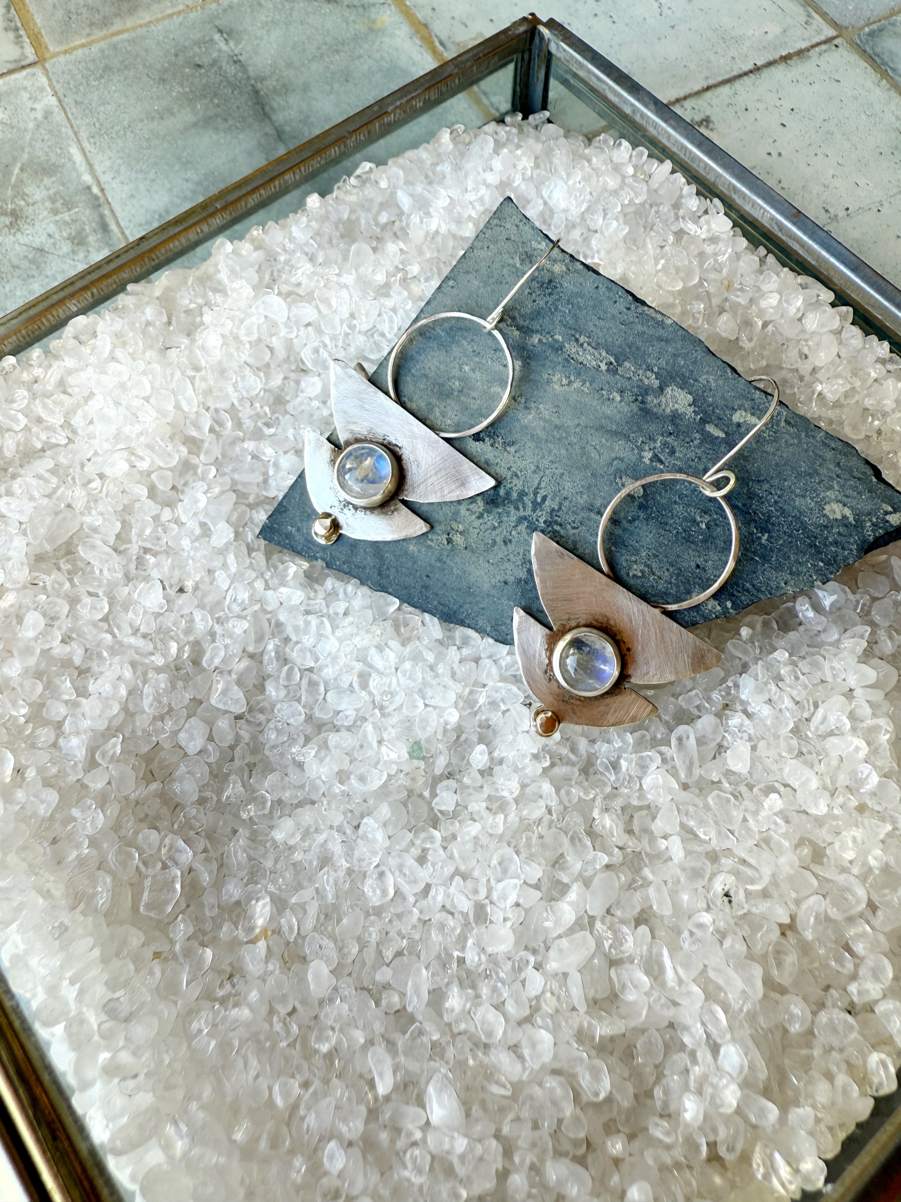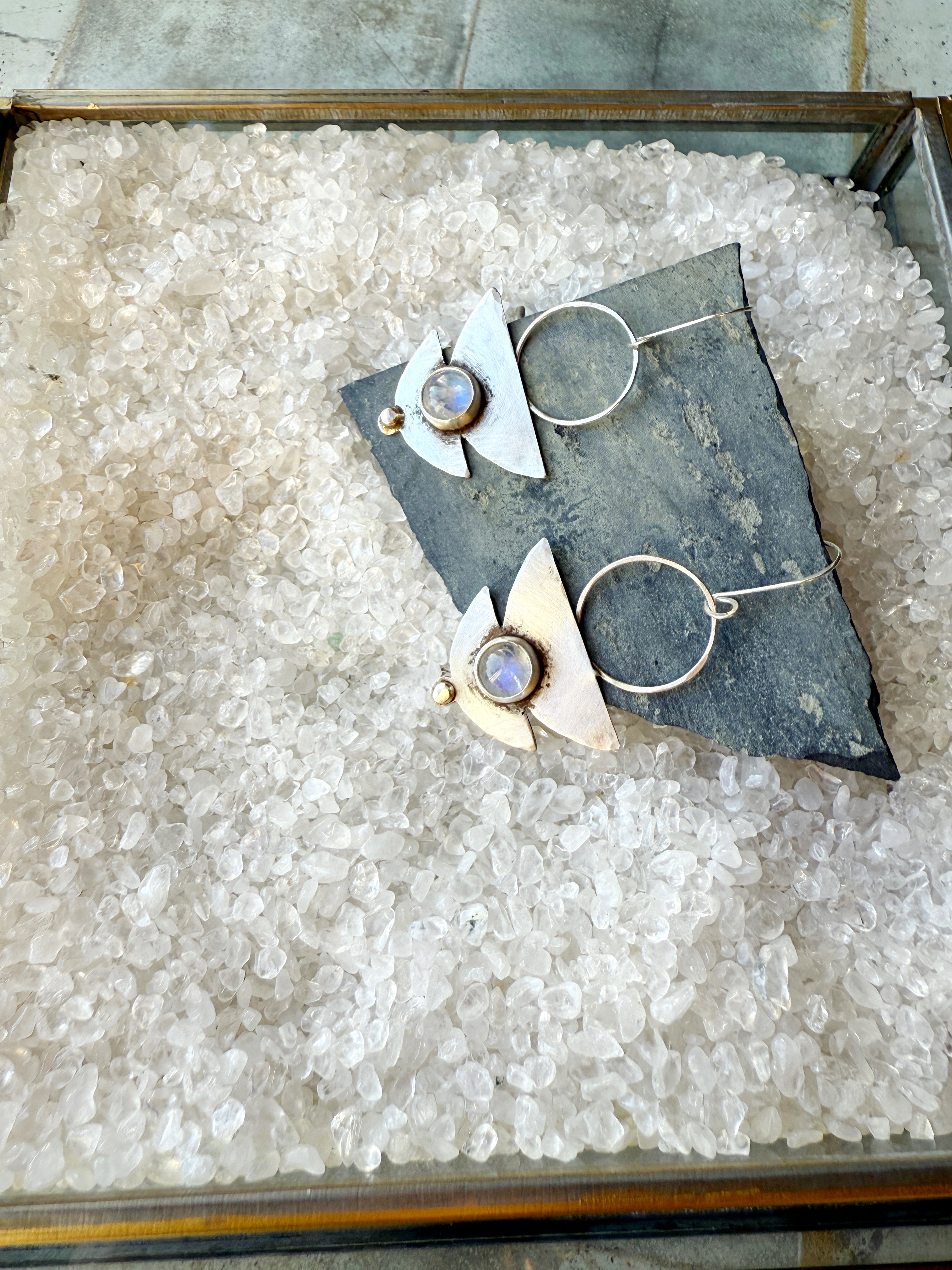 One of a Sterling silver earrings made with high quality moonstones and a 14K gold accent.