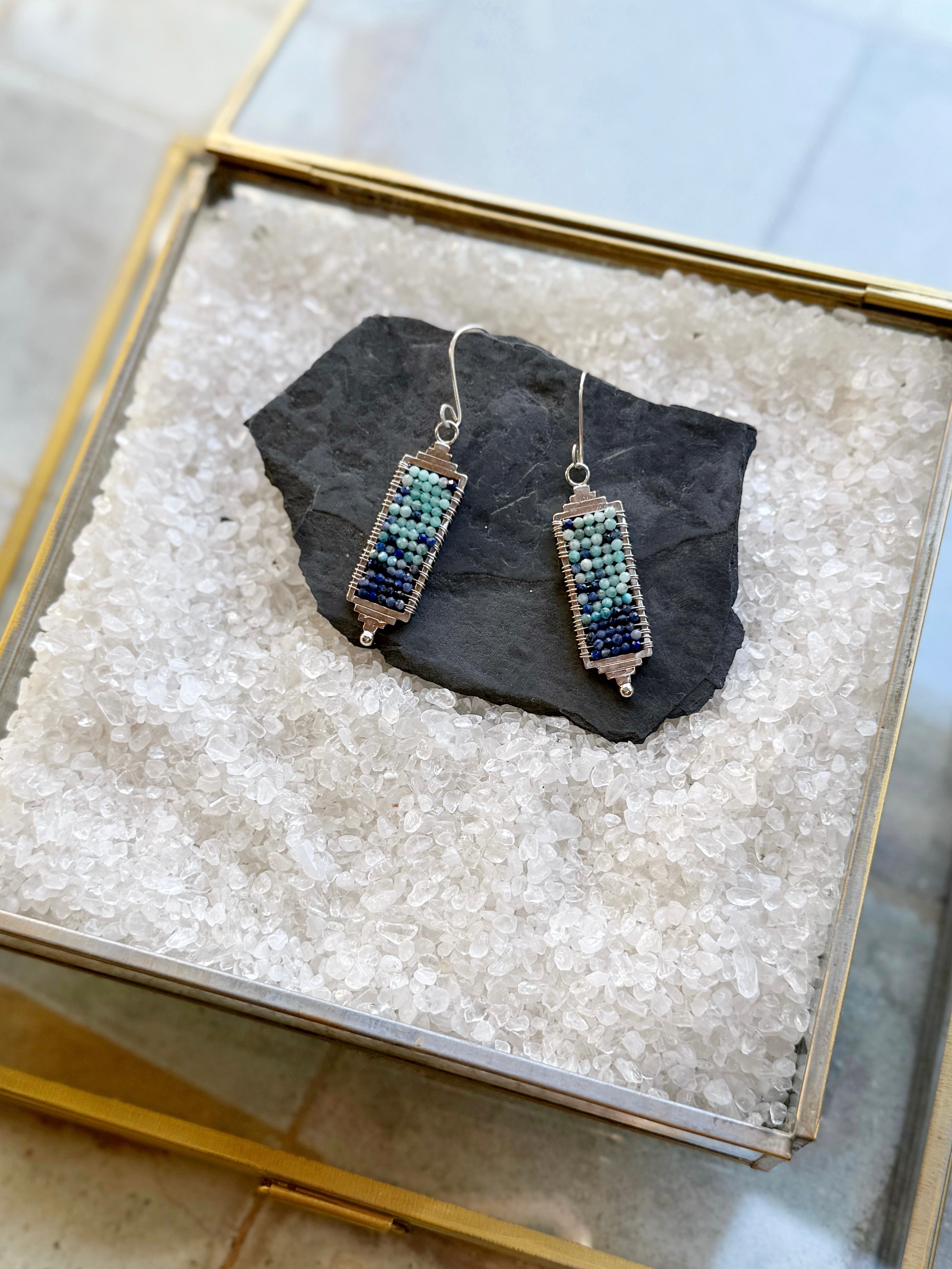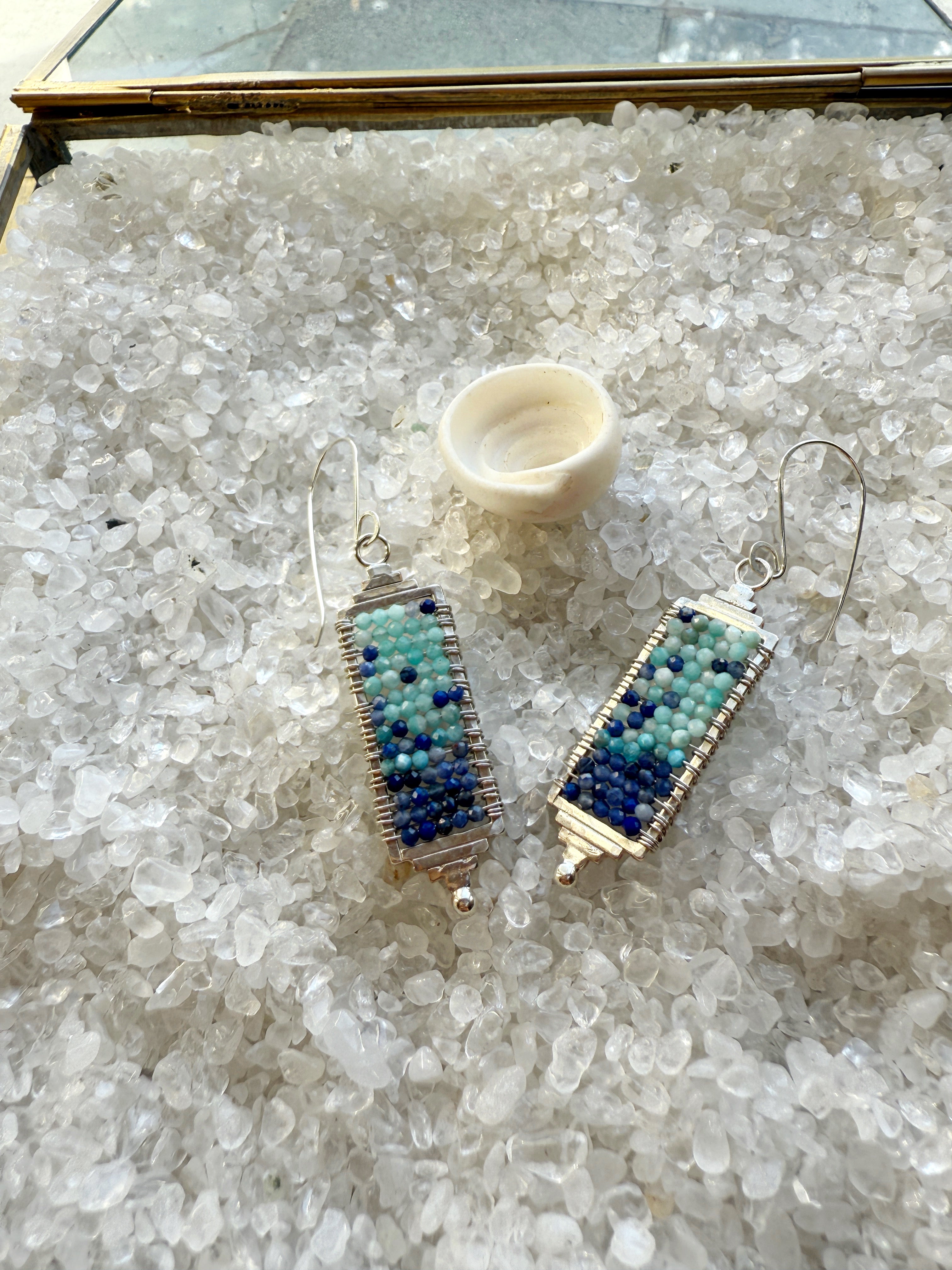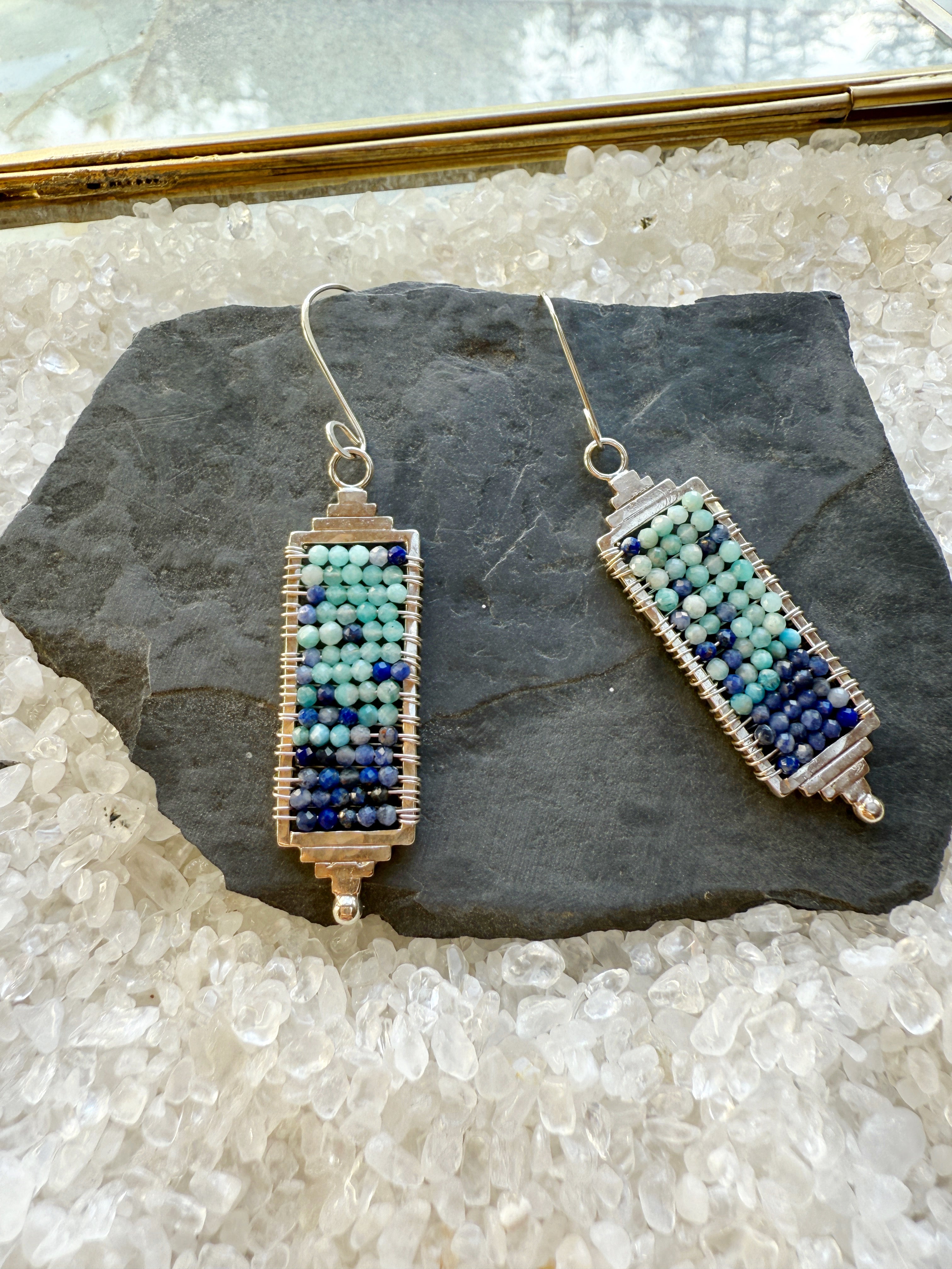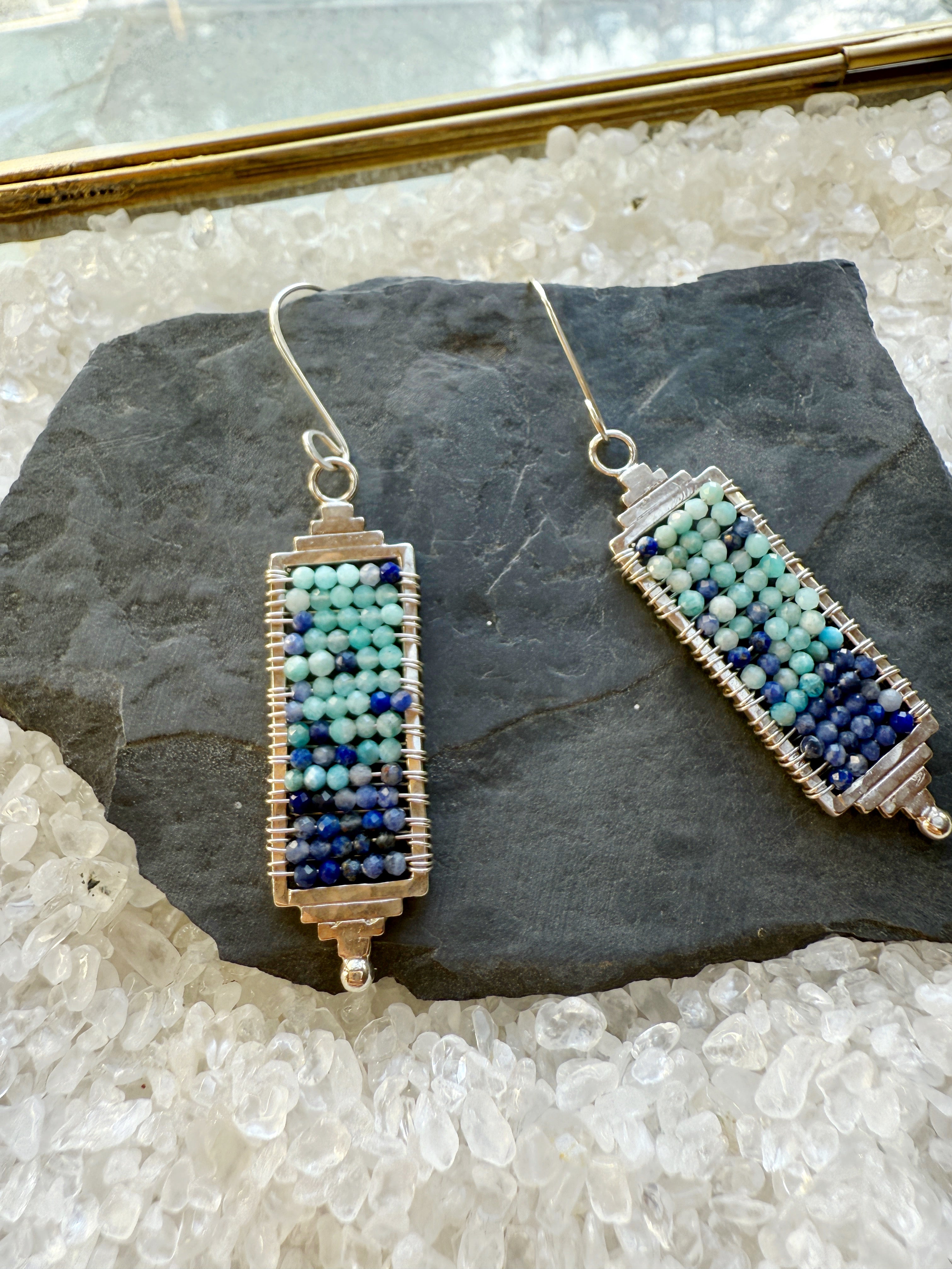 One of a kind Sterling silver earrings made with tiny faceted amazonite and lapis stones.