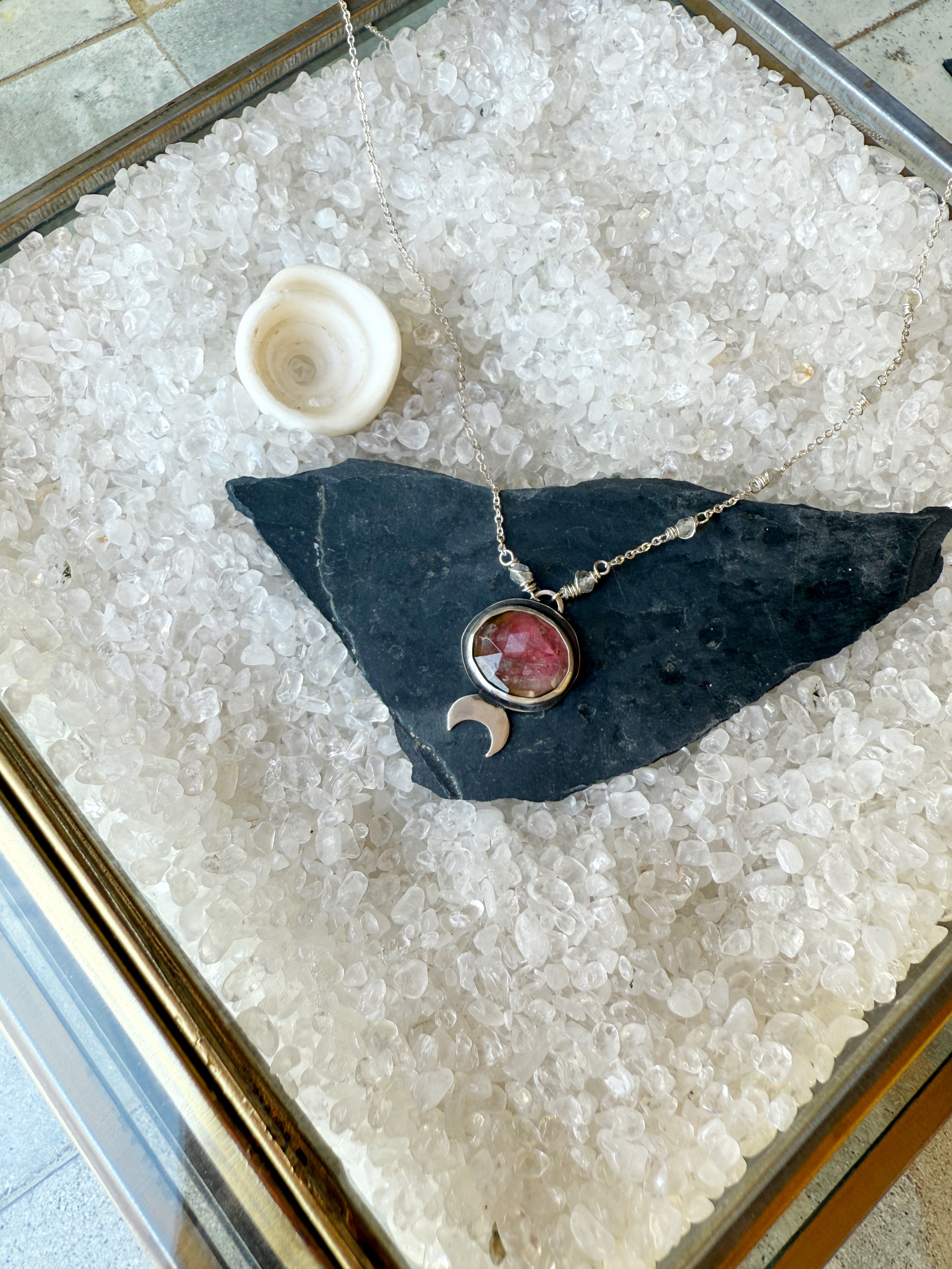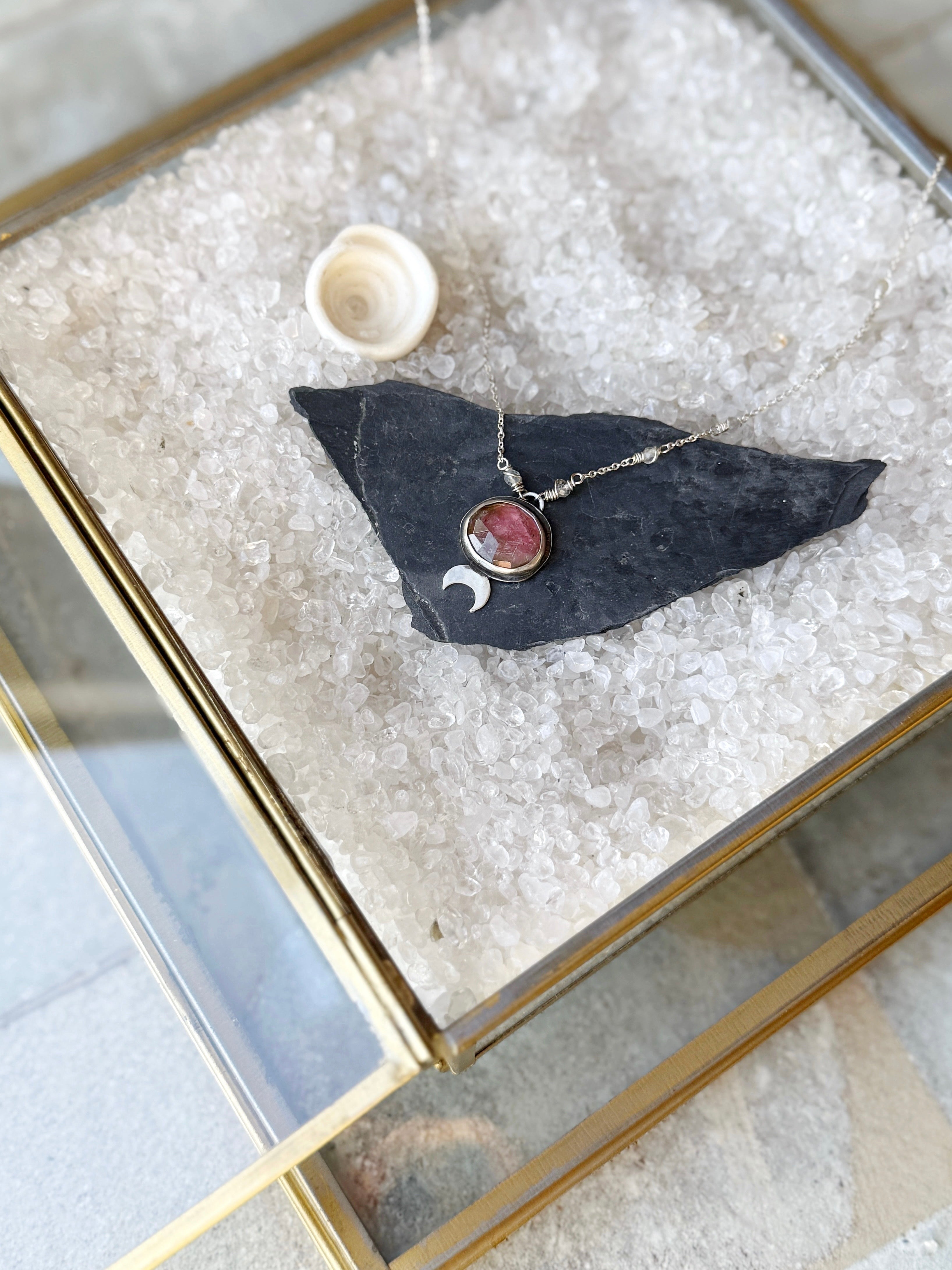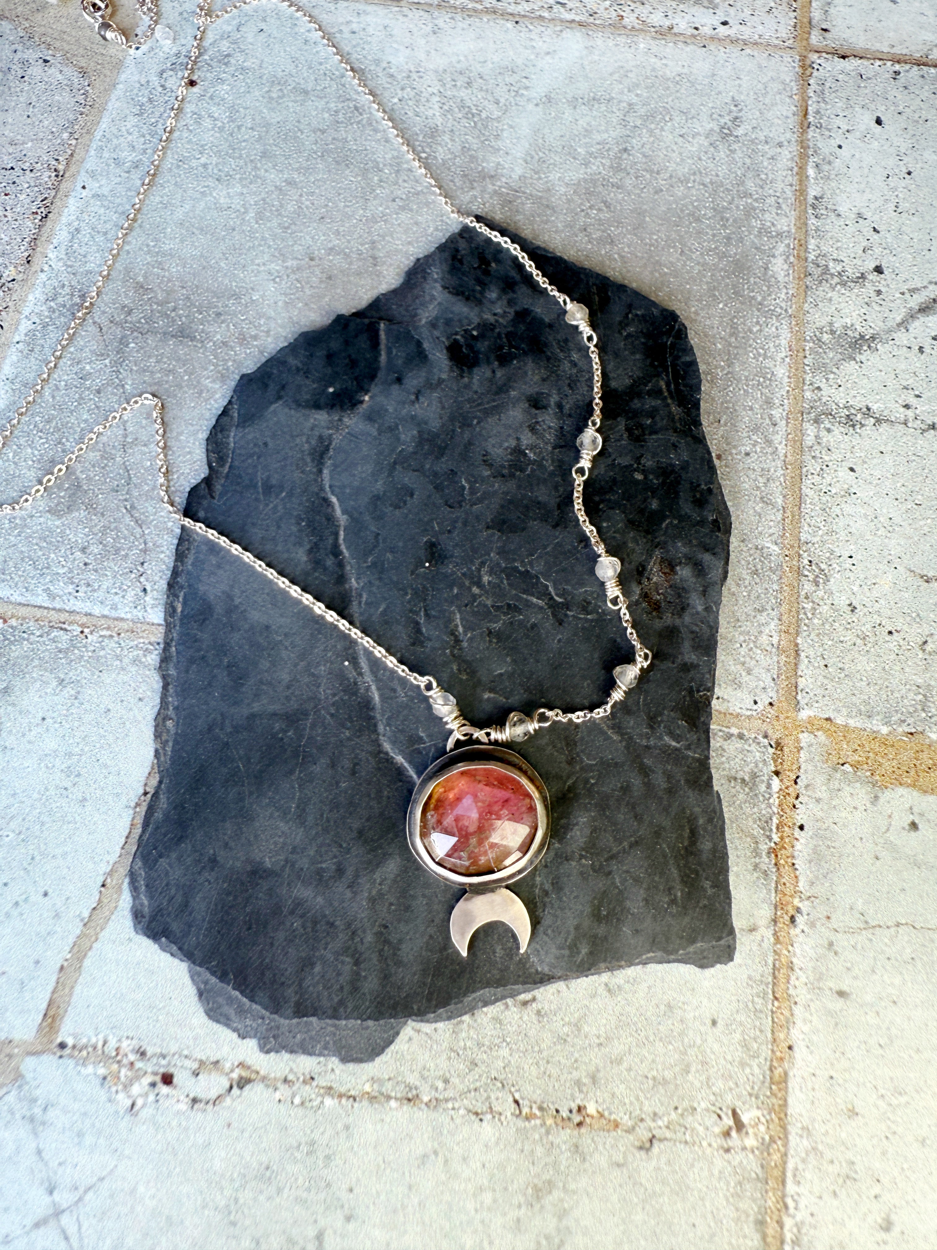 One of a kind Sterling silver mini moon pendant made with pink tourmaline, on a 20" chain adorned with tiny moonstone beads.