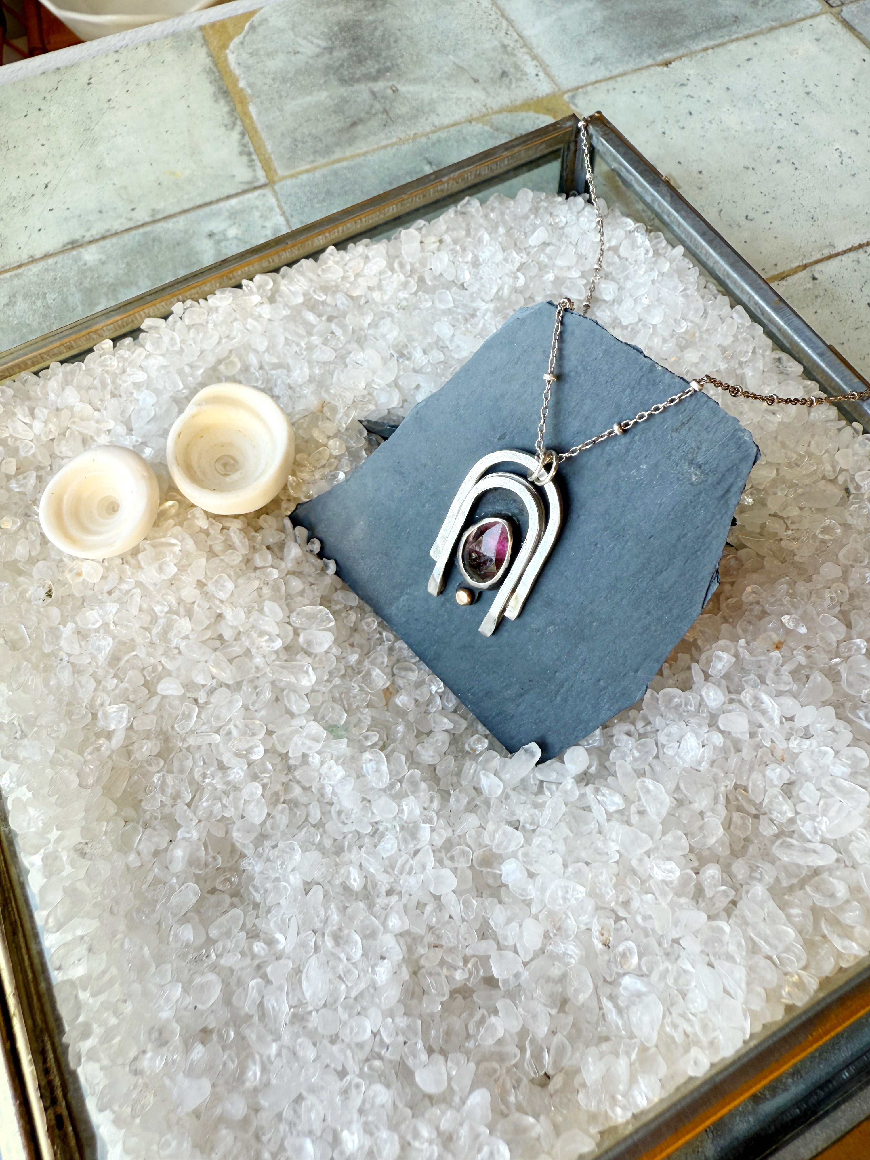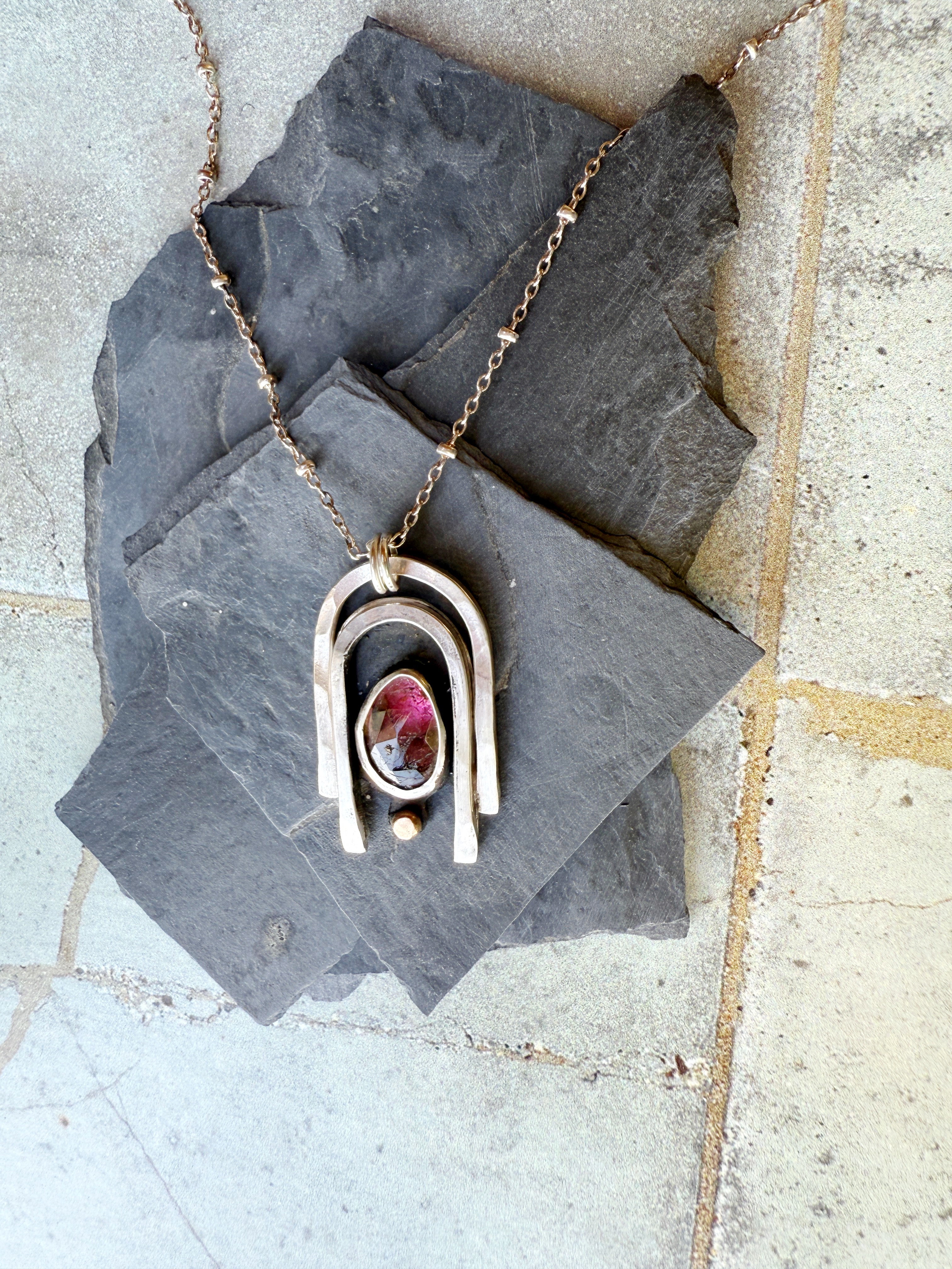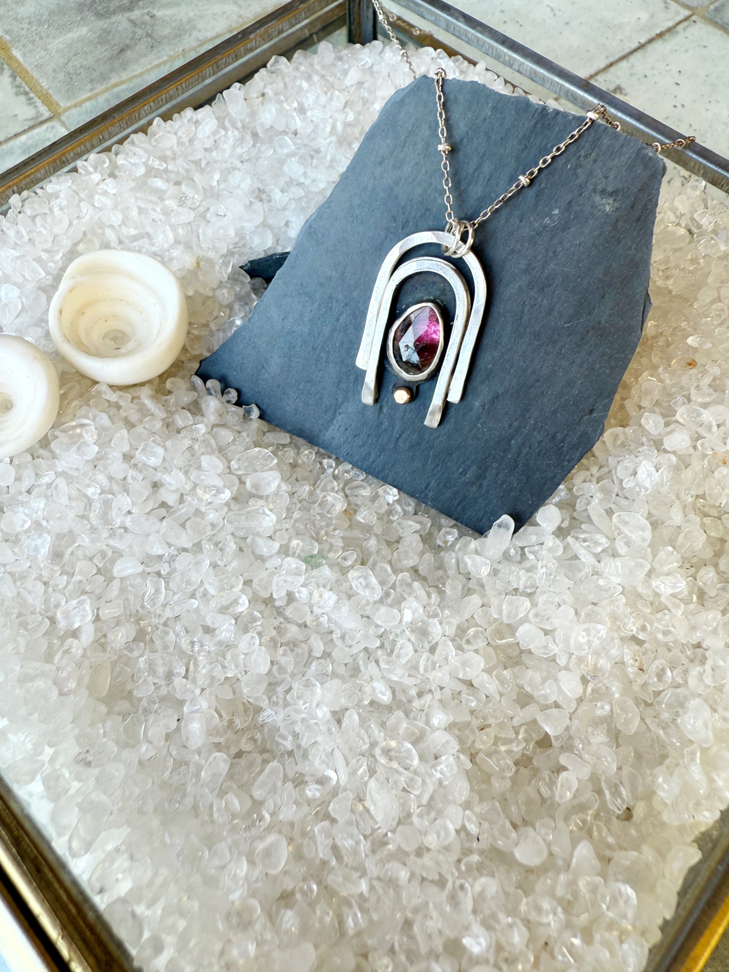 One of a kind Sterling silver pendant made with pink watermelon tourmaline and adorned with 14K gold. Pendant comes on a 21" Sterling silver beaded chain.